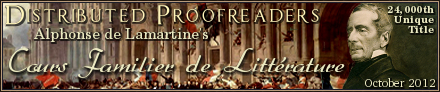 But the “Cours Familier de Littérature”, written for his living during 13 years, from 1856 until his death, is not so well known, and most probably is totally ignored by many people, French or not. That is why I have chosen and started, in 2007, to produce the 20 volumes of the series available on Gallica with Distributed Proofreaders.