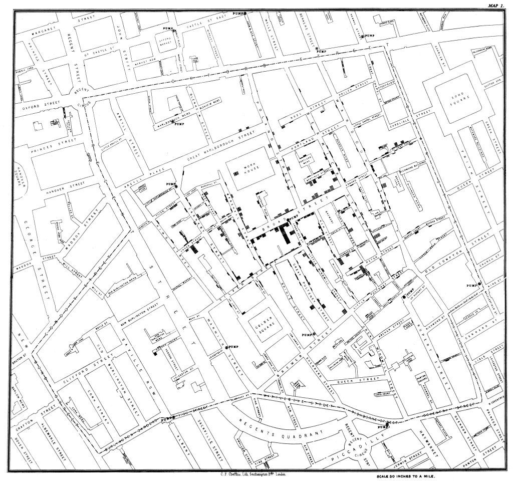 Snow was able to put his theory to the test in 1854, when an outbreak in the Soho district of London killed 600 people in one week alone. Research by another scientist had already shown that cholera cases in another district plunged after the local water company changed its source to a cleaner part of the Thames River. Encouraged by this, Snow set out to test the waterborne theory. He used government death records to identify the cholera victims’ residences in Soho. He conducted house-to-house interviews of their families and learned that they drew their water from a particular well on Broad (now Broadwick) Street, as did a number of local businesses, including pubs and restaurants that some of the victims frequented. Rich and poor alike were affected; poverty and overcrowding were clearly not the cause. His map of the outbreak (above), with black bars indicating cholera deaths, vividly proves his point.