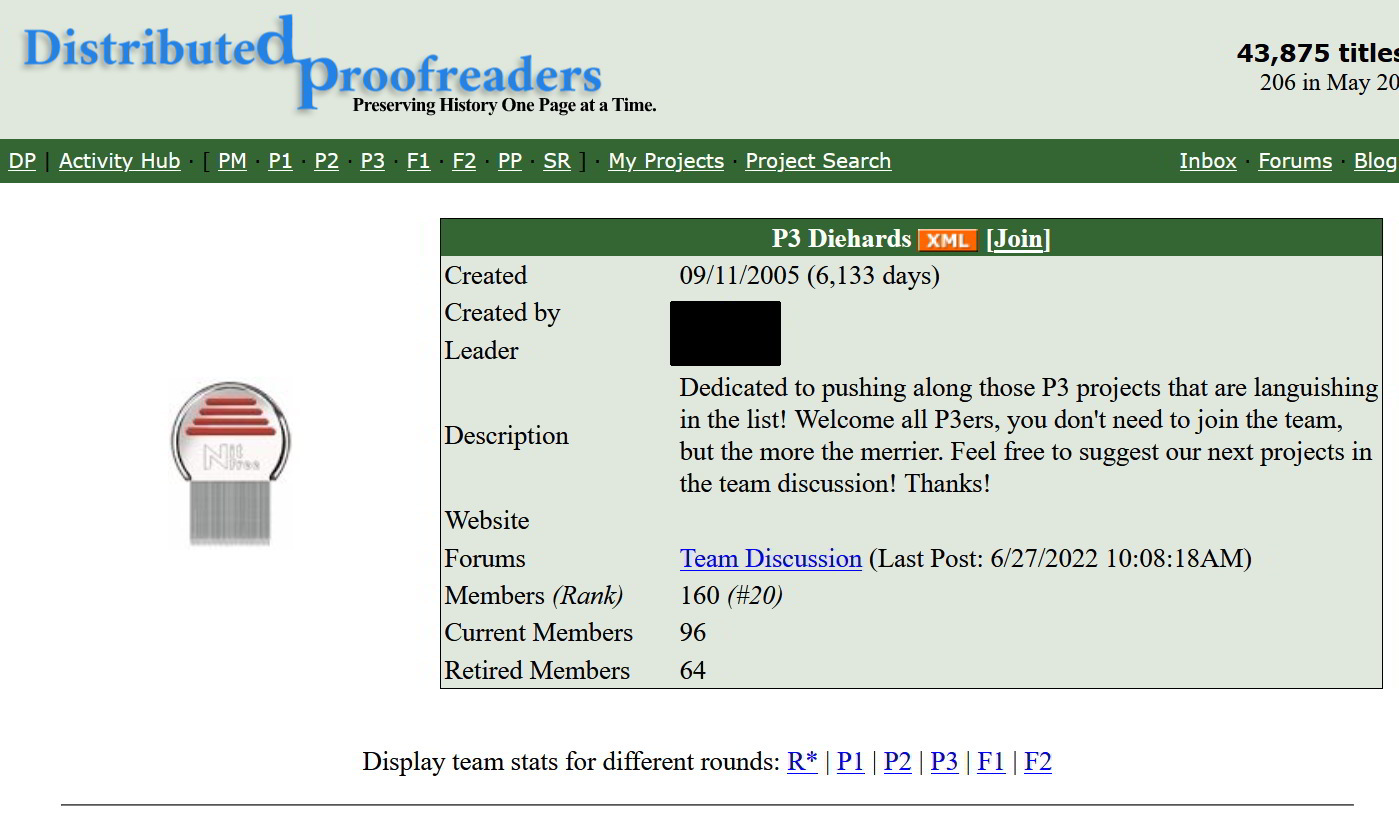 And then one day it happened. A private message arrived in my inbox announcing my access to P3! I think it was maybe 30 seconds later I became a member of the P3 Diehards team. What a great group and a great goal – to save the old books from languishing in the P3 round for more than 100 days. Of course, there are other great teams at Distributed Proofreaders; this one just spoke to me. (I even wrote a poem about it!)